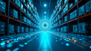 You could picture an animated-style graphic of a modern warehouse. In the foreground, a tablet displays predictive charts showing demand forecasts. In the background, AI-powered robotic arms efficiently sort packages, symbolizing the fusion of data and automation.